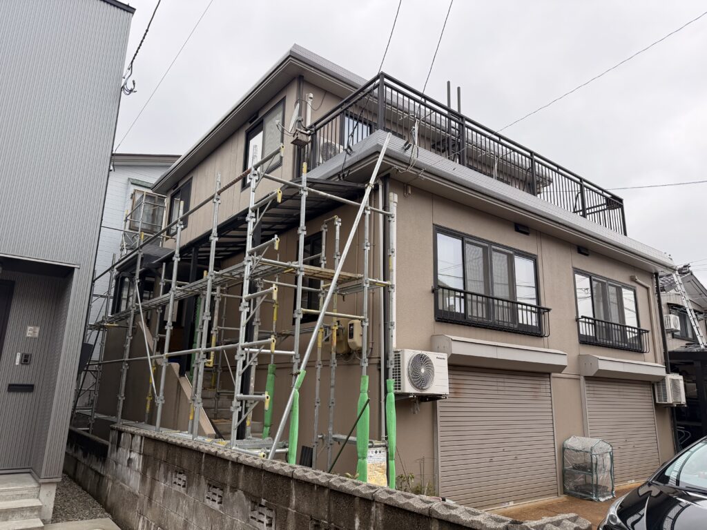 【新潟市東区】外壁一面カバー工法・コーキング打ち替え工事|足場組立完了のお知らせ|株式会社新潟琥建