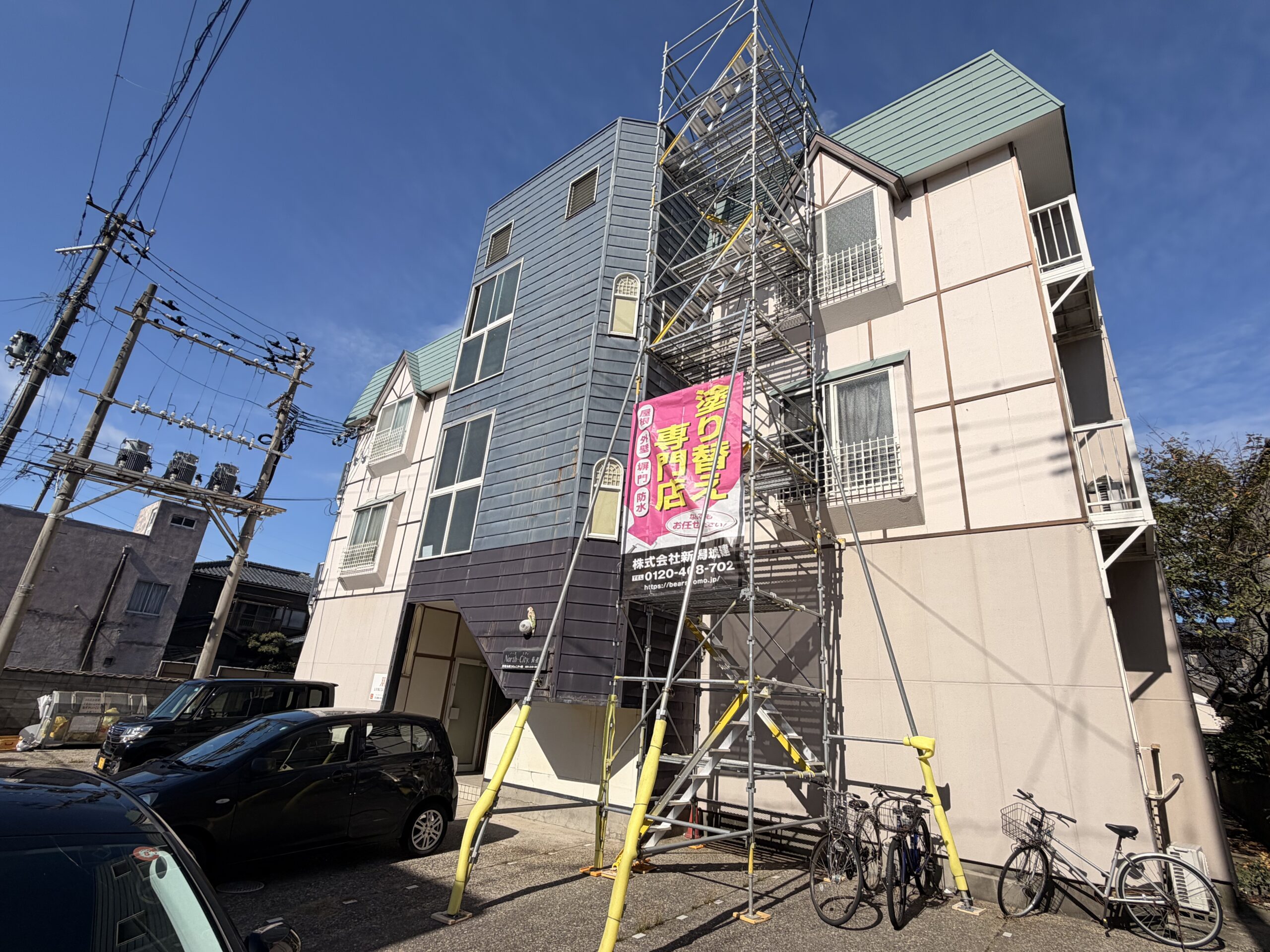 新潟市東区にて、アパートの折半屋根の雨漏り補修・塗装工事を着工しました。